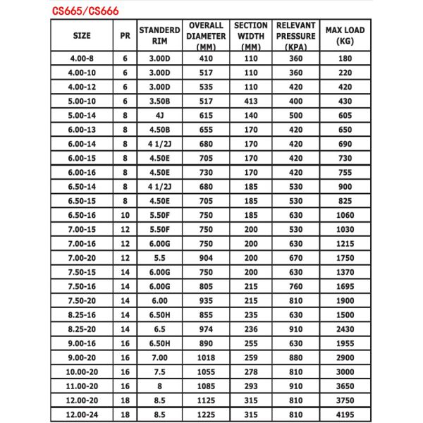 | Size | Ply | Tread Depth (mm) | Load Index | Speed Symbol | KG(LBS.)Load Capacity | Pressure Kpa(PSI) | Stamdard Rim | |