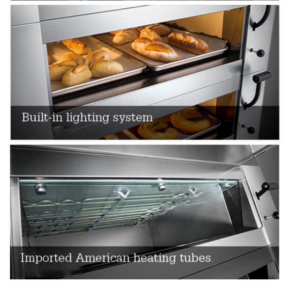 Big capacity electric commercial three deck nine trays bakery oven ,which is made of high quality stainless steel and equipped with good stability American heating tube inside.Upgrade digital quantity intelligent control system and build in light system, make you easy to operate.Each layer can be controled separately and automatically.It has a built-in or outboard steam system, which can quickly produce saturated steam with a qualitative pressure.