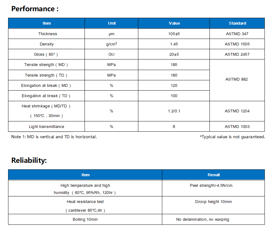 | Heating Shrinkage ratio 105 ℃/10min | ≥-8.0 % (longitudinal) &≥-4.0 %(transverse) |