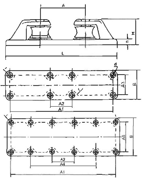 This kind of fairlead roller has 3 rollers made of casting steel or casting iron. It is mounted on the deck with holding down bolts. It is mainly used on barge and engineer boat. It is fitted on the shipside or ship forward or after deck. It has 2 rollers and open type