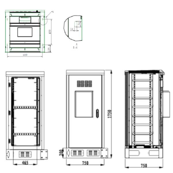 | Structure | (1) One front door (2) Anti-theft three point lock(support padlock) (3) Door stopper is installed on the inside of the cabinet door (4) Door with good sealing, waterproof and dustproof (5) Include standard 19“ rack inside the cabinet, high compatibility. (6) Equipped with cable manager (7) Cable inlets at the bottom of cabinet | |