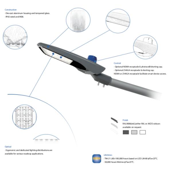 LED Street light series is a flexible yet powerful,easy to maintain LED street light lantern. It is a high performance,extremely high efficacy platform that offers different dimming control options. The luminaire is specially designed for ME1-5 type road applications,which ensures excellent visibility for drivers and good comfort for pedestrians.