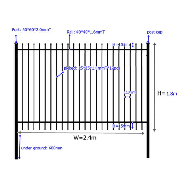 AU using 2.4m width by 2.1m High security pipe wrought iron steel fence