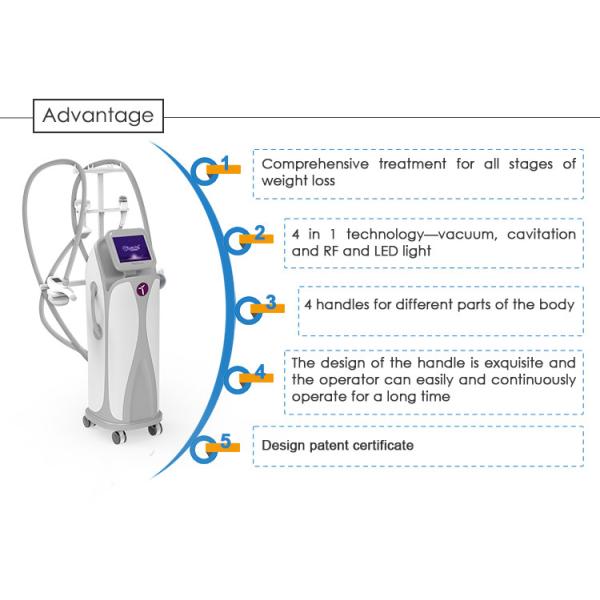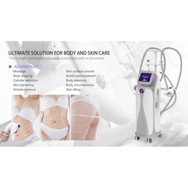 It combines the Mono-polar &Bi-Polar Radiofrequency (RF), Infrared Light, Vacuum and Mechanical Roller. The precise heating of RF ensures safe, effective, fast treatment without downtime. Vacuum and specially designed rollers for the Mechanical Massage smooth the skin to facilitate safe and efficient heat energy delivery. It increases the metabolism of stored energy and lymphatic drainage and reduces or shrinks the size of the actual fat cells and fat chambers.