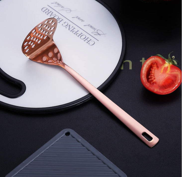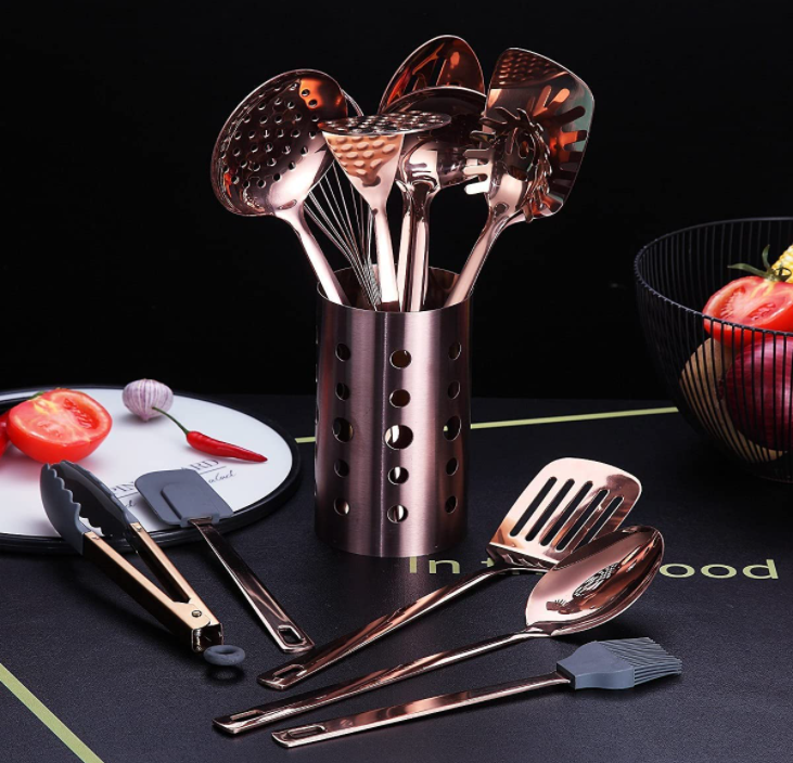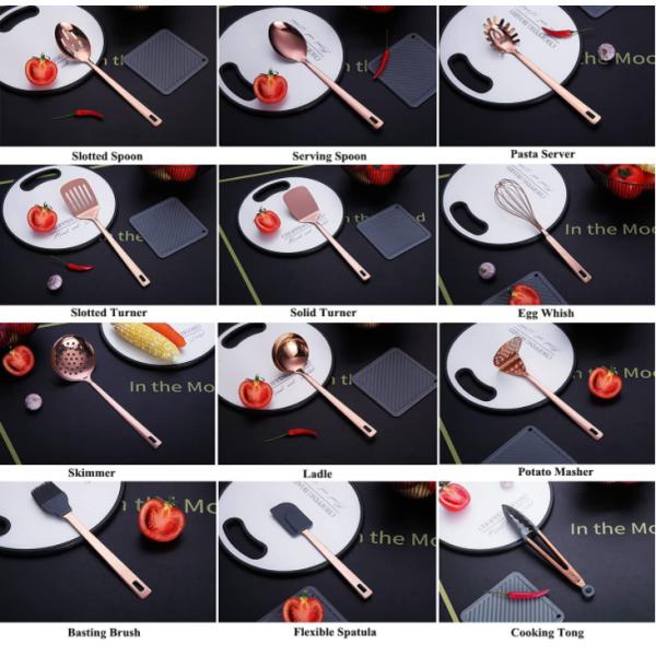 4.Titanium Rainbow Noble Plating: The rainbow color plating make this utensils set stand out in your kitchen. This Kichen utensils set is so beautiful and great that You will get a lot of "like", "praise", "laud" from your guests when they visit your kitchen, from your funs when you share a video shot of your kitchen. This is the right utensil set that you worth to have.