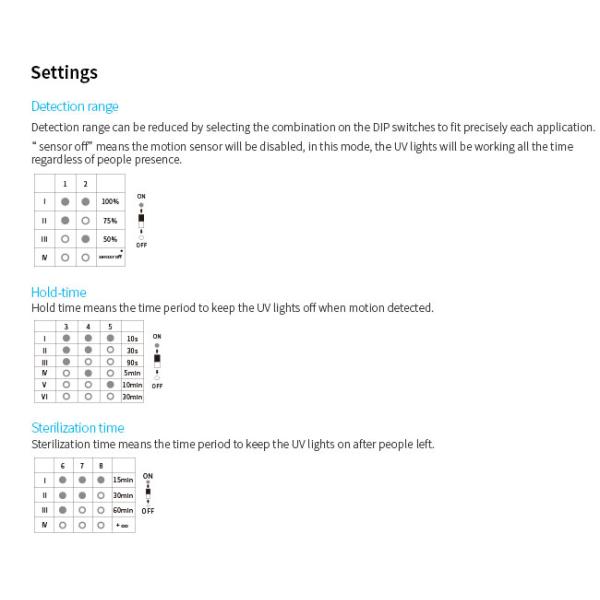 sensor off” means the motion sensor will be disabled, in this mode, the UV lights will be working all the time regardless of people presence.