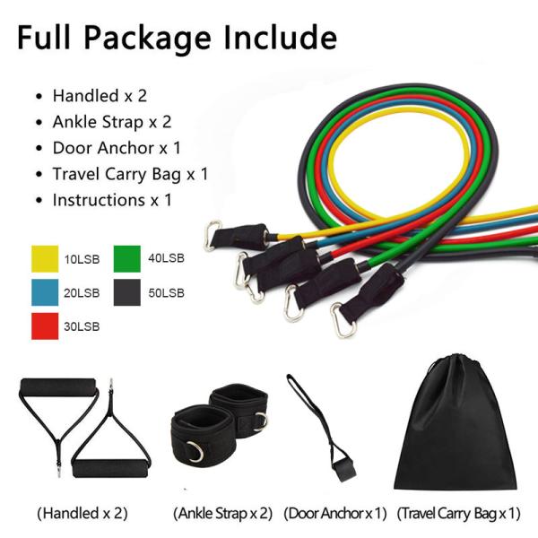 Including of handled*2, ankle strap*2, door anchor*1, travel carry bag*1 and resistance bands*5, 11 sets is