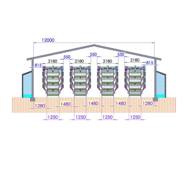 4. Q235 national standard double hot galvanized bridge steel cage,hot galvanized steel feed trough,ball type automatic water equipment ,white PVC pipe ,3MM U type galvanized steel shelves,closed-end pressure-reducer;Al-Zn material feeding system,AL-Zn material manure cleaning system,ventilation system,lighting system,environment controlling system and so on.