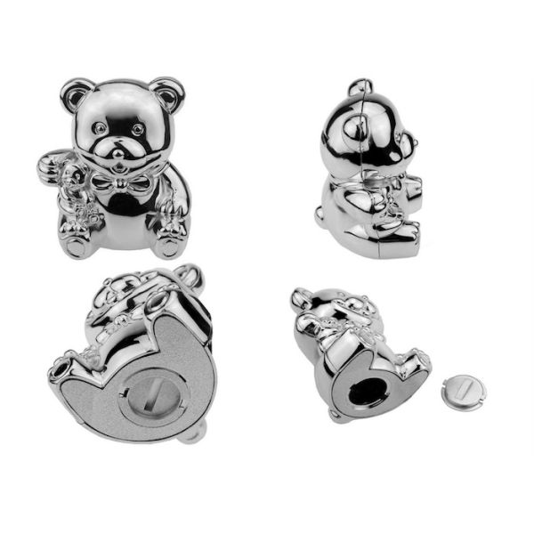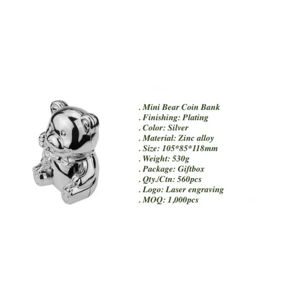 Mini 105*85*118mm Cute Design Teddy Bear Coin Bank Die Casting Zinc Alloy With Silver Plating