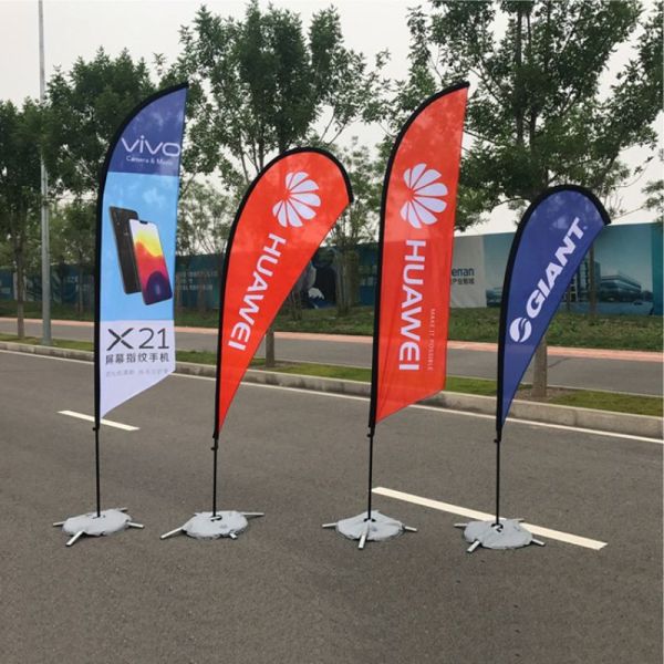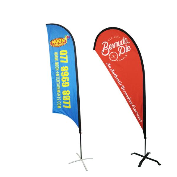 Teardrop flags, commonly referred to as teardrop flag banners or teardrop feather flags, are large teardrop-shaped flags with any custom design printed on them using a dye sublimation process. They are attached to a lightweight aluminum and fiberglass flagpole and are either stuck into the ground or placed on some type of flag stand. This flagpole is bendable, keeping the teardrop flag taut with and without wind.