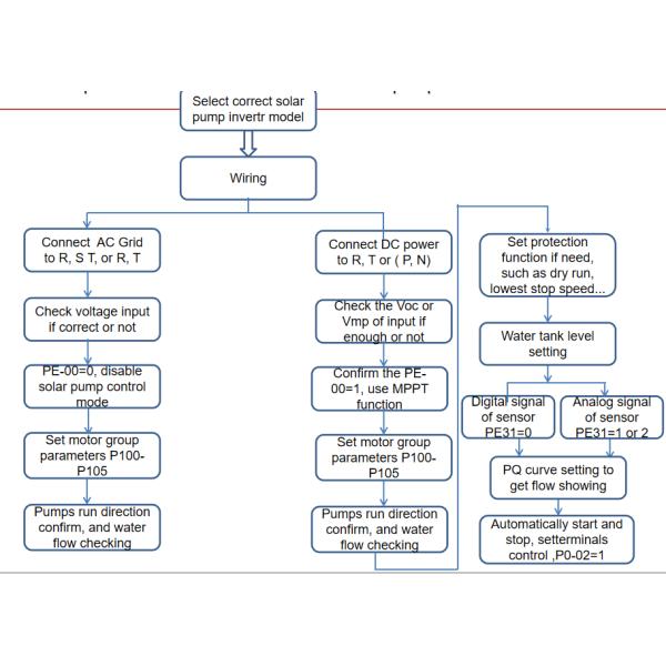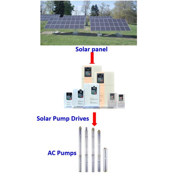 The solar array, an aggregation of many solar modules connected n series and parallel. Absorbs sunlight radiation and converts into electrical energy, providing dynamical water for the whole system. The pump inverter controls and adjusts the system operation and converts the DC produced by solar array into AC to drive the pump, and adjust the output frequency in real-time according to the variation of sunlight intensity to realize the maximum power point tracking( MPPT). The pump, driven by 3-phase AC motor, can draw water from the deep wells or rivers and lakes to pour into the storage tank or reservoir, or directly connect to the irrigation system, fountain system, etc. According to the actual system demand and installation conditions, different types of pump such as surface pump,centrifugal pump, axial flow pump, mixed-flow pump or deep-well pump can be used.