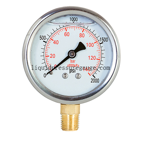 2-1/2 inch Pressure Gauge, glycerine, 0-2000 psi/bar/kpa, 1/4 BSP lower mount, stainless steel case and brass internal
