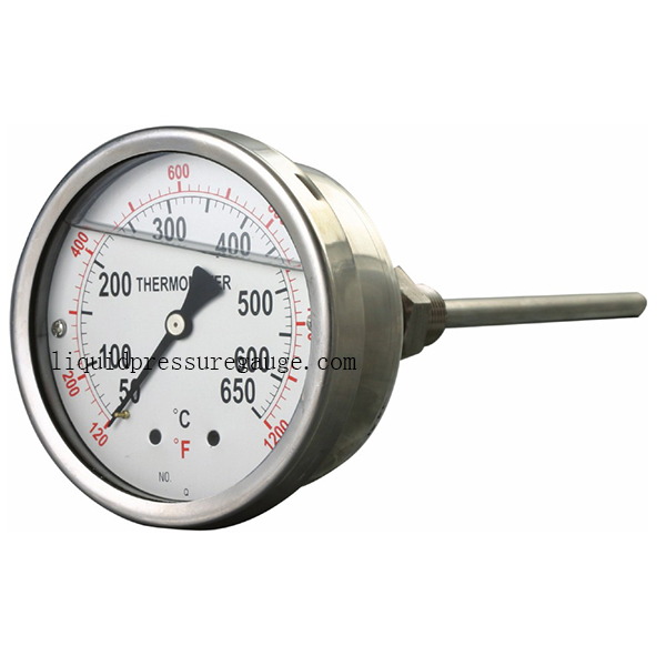 4 inch liquid filled Bimetal thermometer, glycerine, stainless steel bayonet case, ss stem,1/2 NPT lower mount, 60-650℃