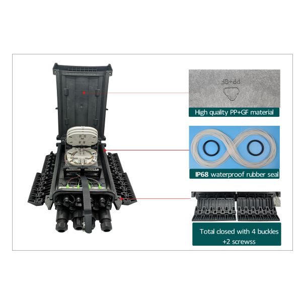 | Cable ports | 1 input cable port for un-cut cable from diameter from10~17.5mm. 2 output cable ports for cable diameter from 8~17.5mm. | Single splice tray capacity (Single fiber) | 12 cores |