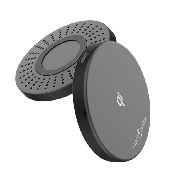 The Qi wireless fast charger with smooth surface round arc design for comfortable grip . Bottom with hundreds bottom holes for fast heat dissipation and keep the charging pad cool and fast charging mode.