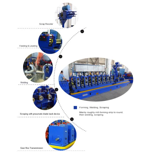 Steel coil→→ Double-head uncoiler →→Strip-head Cutter and welder→→Spiral Accumulator→→Forming section(Flattening unit +Main driving unit +Forming unit +Guide unit +High frequency induction welding unit +squeeze roller)+ Deburr frame →→Cooling unit →→ Sizing unit and straightener →→Flying saw under computer-control →→ Run-out table