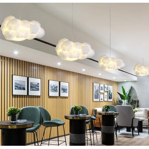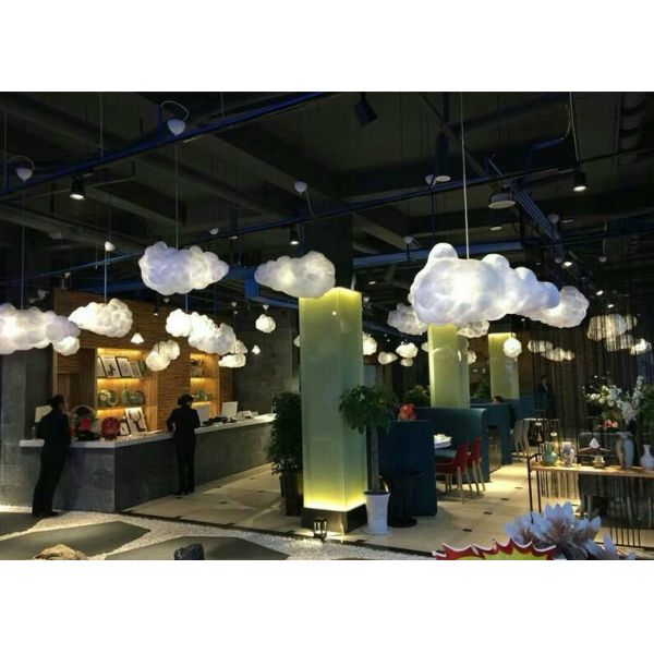 The product uses natural defatted space cotton PVC imitation silk material, fireproof, white, light, durable, easy to clean, and the cloud lamp has a variety of different shapes, suitable for theme restaurant, kindergarten, playground, shop lights, RGB light is also suitable, if you need, please contact us for consultation.