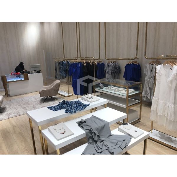 You can see for woman clothing store. These golden and white colors would be much more suitable. Ladies would be attracted by these bright and shiny colors. Moreover, These can be dis-assembly pack to save some container space in order to save some shipping costs. You can place three or five store displays once time to save lots of import costs for your chain store business.