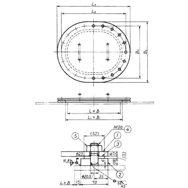 Drawing of JIS F 2304 Type B Flush Multi Bolt Oval Manhole Marine Outfitting