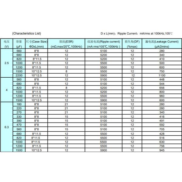 | Conductive Polymer Aluminum Solid Capacitors | PC | -55~+105 | 6.3V | 1500 | 10*12.5 | 5900 | 2000 |