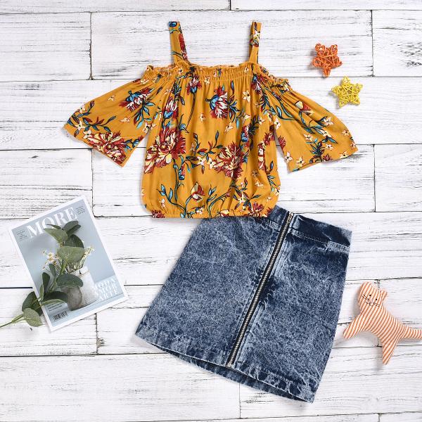 Summer Cchildren's outfit sets girls cotton printed sling top + zipper denim cardigan skirt girl suit