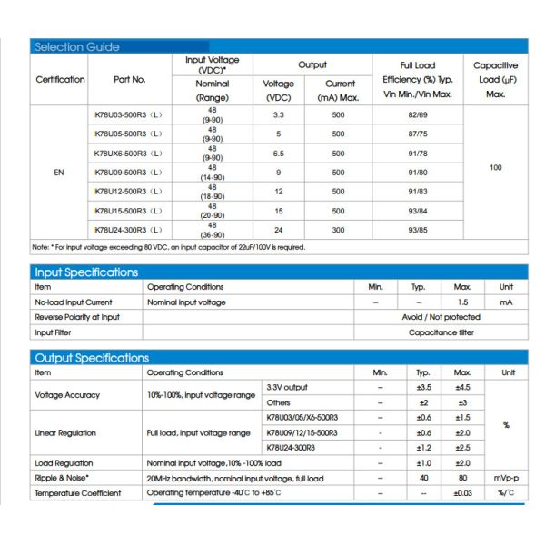 K78Uxx-500R3(L) series are high efficiency switching regulators. The converters feature high efficiency, low loss and short-circuit protection in a compact DFN package. These products are widely used in applications such as industrial control, instrumentation and electric power.