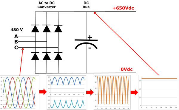 Let us assume that the drive is operating on a 480V power system. The 480V rating is “rms” or root-mean-squared. The peaks on a 480V system are 679V. As you can see, the VFD dc bus has a dc voltage with an AC ripple. The voltage runs between approximately 580V and 680V.