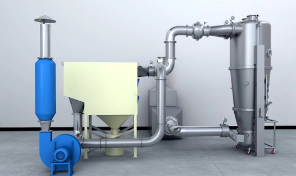 enters into the drying chamber and blows up the material in the