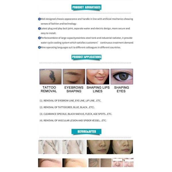 1.1064 laser head, effectively remove dark tattoos, eyebrows, lip, eyeliner and traumatic pigmentation and freckles.