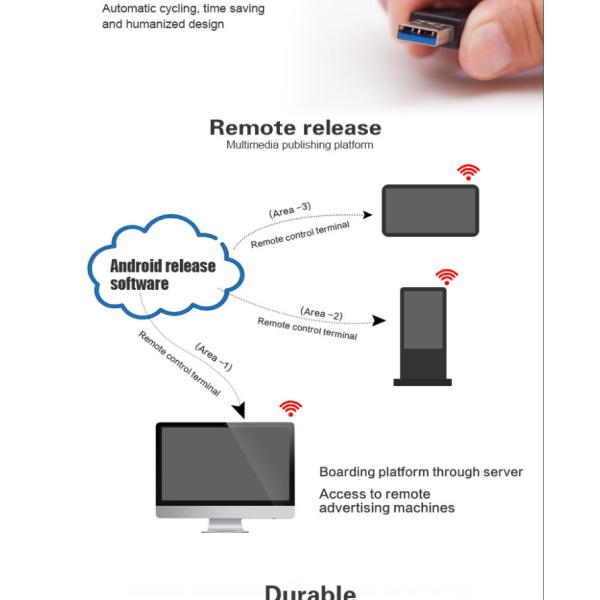 Also, we have Android system on option, with remote control software, you can use IP server or Cloud server to update thousands terminals' advertising at the same time, this is what we called network ad player.