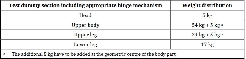 The total mass of the dummy including any hinge mechanisms is 110 kg.The weight distribution of the sections of the test dummy shall be in accordance with Table 1: