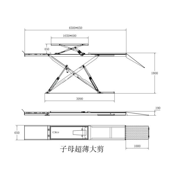 Low-profile multi scissors build,anchor on floor 4500mm runway for cars of longer wheel base Fine tuned climb-lock for leveling accurateness Cam drived by 4 cylinders, smooth & durable Cost option wireless remote control operation Secondary jack extendable for more car models 5 covers in different size, for turn plates in sizes and cars of wheelbases. Anchor base made from one-piece metal sheet,smooth operation and leveling adjustment Lifting capacity 4000kg Secondary jacking capacity 250Okg Lifting height 1800mm Secondary jacking height 400mm Minimum height 210mm Runway width 600mm Runway length 4500mm Lifting time60s Rated hydraulic pressure20-30Mpa Air supply 0.6-0.8Mpa Motor power 2.2kw Power supply: 220v,240V,380V,415V Welight :2310kg