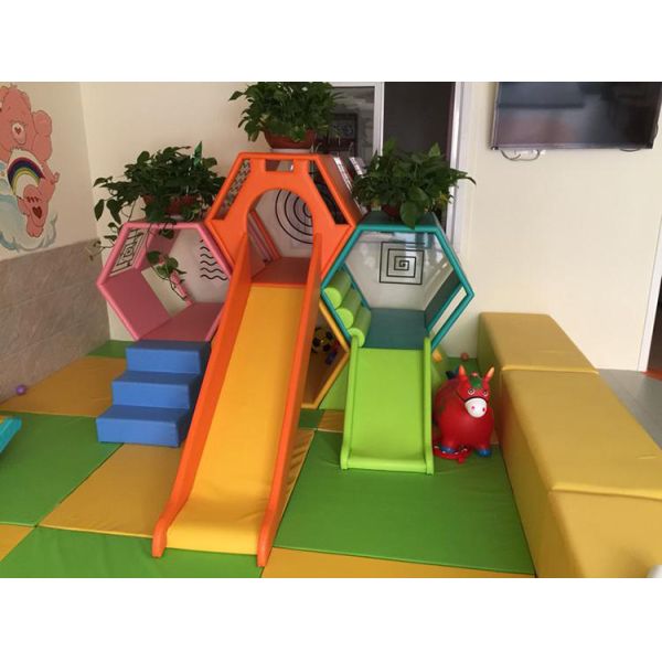 Honeycomb soft play is the equipment for kid to climbing, slide down and play maze. Each honeycomb have a climbing soft leader, the kid can climbing through this from one honeycomb to another, until they find the entrence of the slide. This type of slide is not so large, it's special good for toddlers. The honeycomb is easy for parents to take care of their kids. The honeycomb have 2 types, one is 4 honeycombs, the other type is have 7 honeycomb. It is depends on your budget and how many players to choose which one.