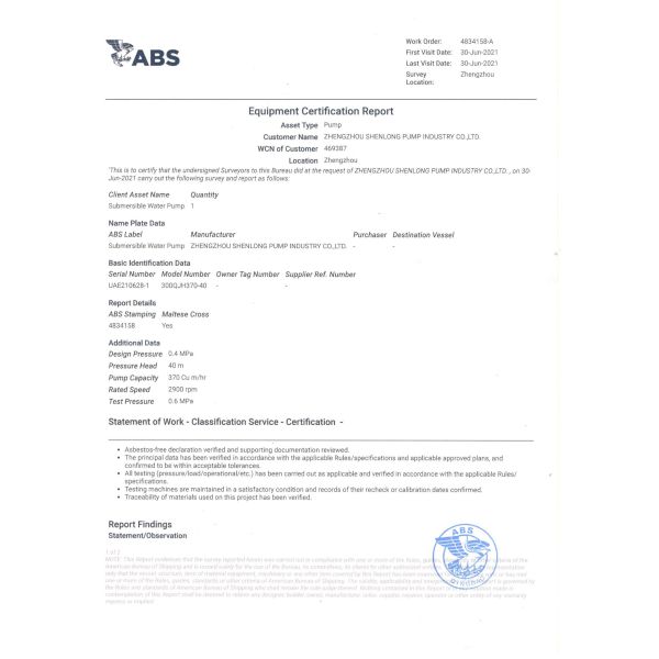 They required the sea water lifting submersible pump to come with a non-return valve, 415V, 3 phase, 60HZ, 75 Kilo watts, 146Amps, with cable length - 8 meters. please note that pump will need to come with ABS Class approval.