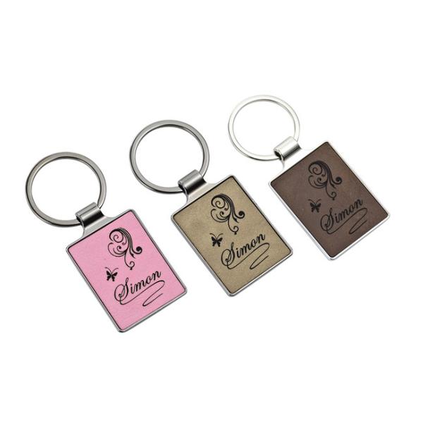 This is a laserable PU metal key tag.Rectangle shape with product size is 35x55mm,thickness is 4mm.The metal part is zinc alloy with shiny nickel electroplating.On the front is laserable PU.This PU is different from other PU leather.Because you can laser the logo on it,same as the laser on the metal plate.The metal ring is made of iron with shiny nickel coating,dia is 35mm,you can change it to 32mm,30mm,28mm.