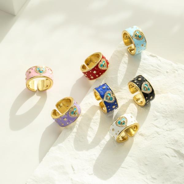 18K Gold Ring Adjustable Cubic Zirconia CZ Evil Eye Love Heart Dripping Oil Rings For Women Jewelry
