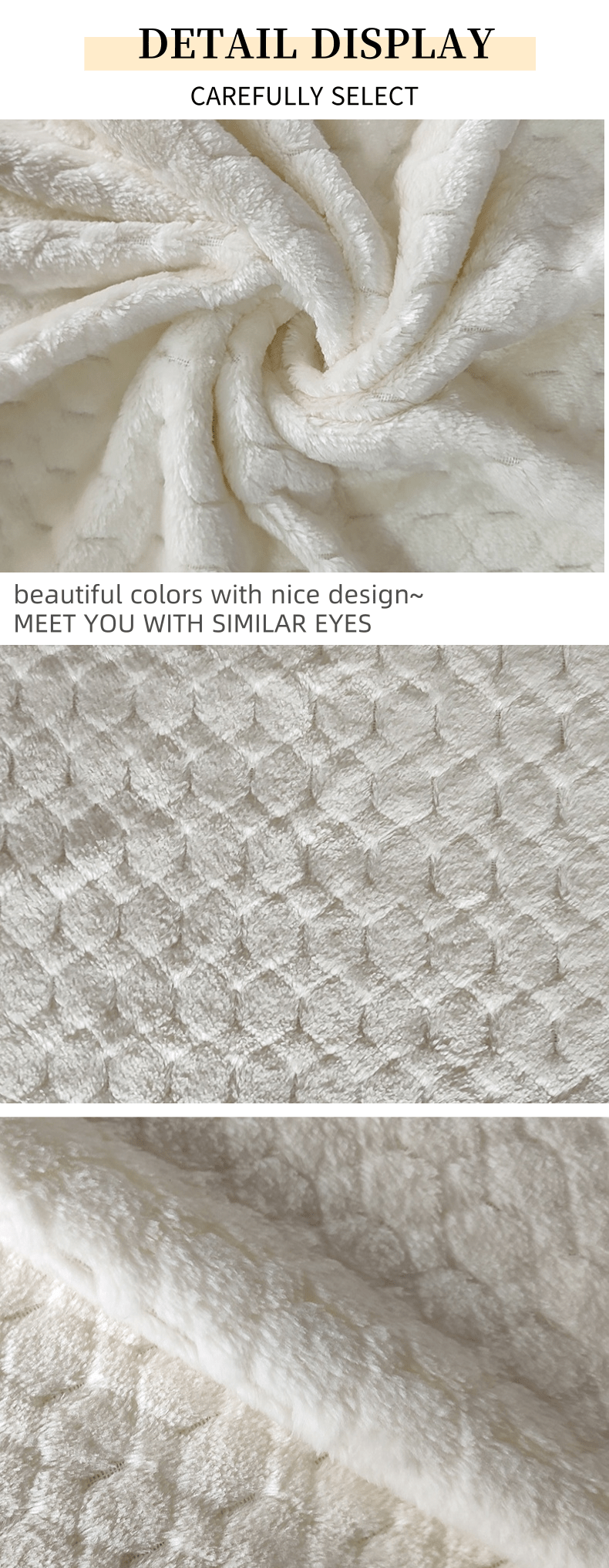 The technology of this kind of fabric is jacquard. This technology can creat a 3D effect. The effect of the pattern looks like quadrilateral and hexagon. Flannel fleece is made of 100% Polyester. Its hand feeling is soft and comfortable. Because it has good warm effect so it can be used to make winter pajamas, bathrobes and other warm clothes. Besides, it can also be used to make flannel blankets because of its soft plush, such as printed flannel blanket, glow-in-the dark flannel blanket, etc. It also can be bonded with other fabrics to process into different products.