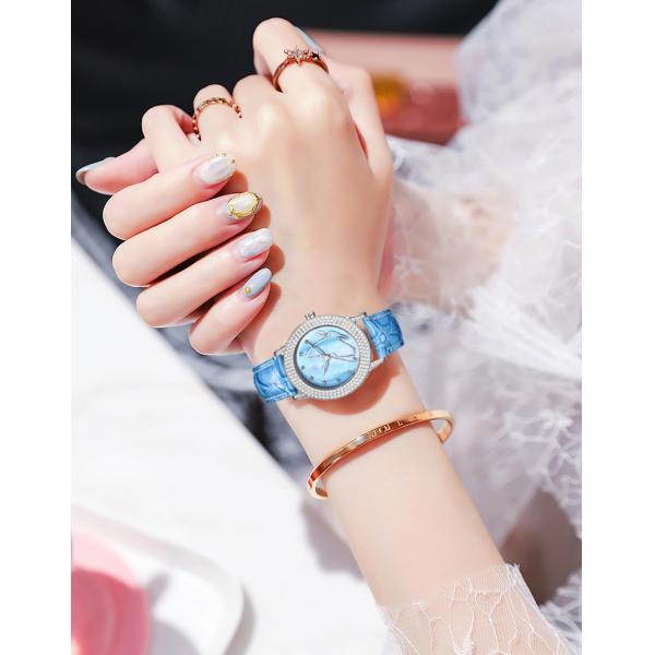 Bule MOP Dial Stones Alloy Case Women Fashion Watch With Genuine Leather Strap