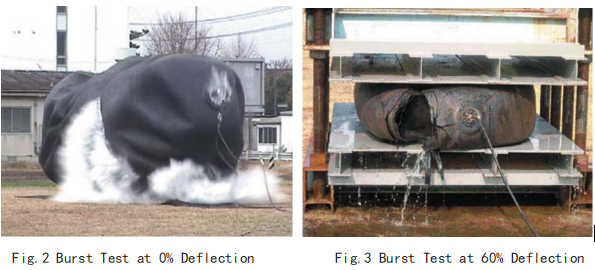 Jerryborg Pneumatic Rubber Fenders are constructed of several layers of strong tire-cord, and are thus resistant to pressure and cutting. The safety factor adopted in the design of this fender is based on accepted theory and has been proven by extensive experimentation. Operational experience over a long period of time attests to its high safety and reliability, and hydraulic pressure tests have proven the strength to be suitable. Furthermore, large-size fenders are equipped with a safety valve to release the inside air in the event of accidental over-pressure. The figure below shows data obtained from many destructive pressure tests at various percentage compressions. Such data are used to establish a basic minimum endurable pressure (MEP) curve for pneumatic rubber fenders.
