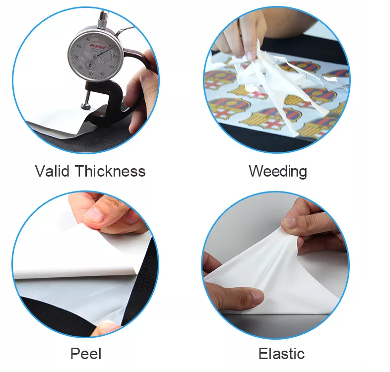 PET heat transferm vinyl is 100um thickness with high temperature resistance and sticky backing. PVC heat transfer vinyl is very easy to cut and peel. No fading and no deformation after high temperature heat press.