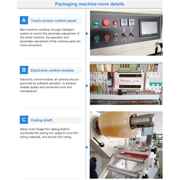1. Double motor,double Panasonic transducer and PLC controller,flexible bag length setting and cutting.saving time and film.