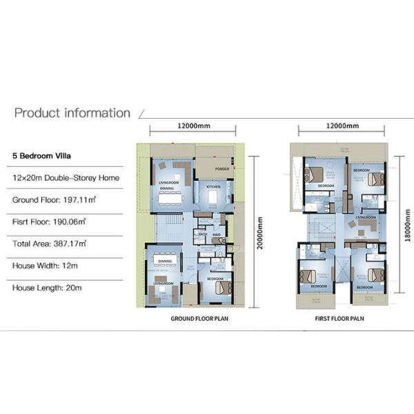 This is a two-story villa with a length of 12 meters and a width of 16 meters. The first floor area is about 163 square meters, the second floor area is about 164.4 square meters, and the total area is about 327.4 square meters. There are two living rooms, a kitchen and a dining room, and 4 bedrooms. , One in the garage and one in the nanny room. It is very comfortable and convenient to live in.