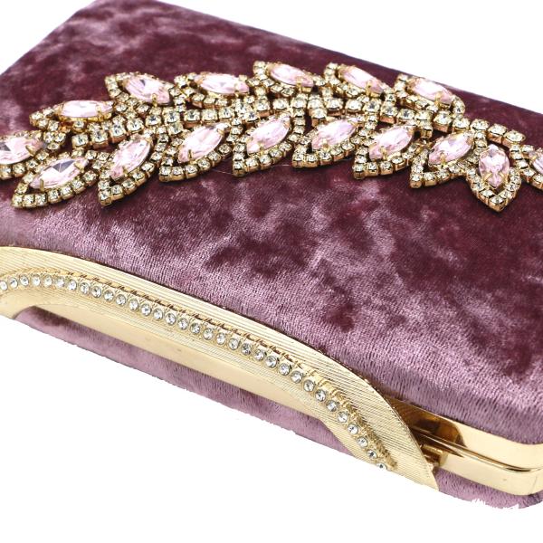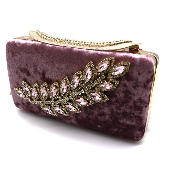 This voilet evening bag make by velvet fabric with comfortable touch handfeel. the clutch in gold color with one line rhinestone makes it very high class. at front side there have a big rhinestone with leaf shape. Inside with black lining and shirnk by elastic for easy open and close. this bag is accompany with gold fine metal chain for handing on the shoulder or by hand.
