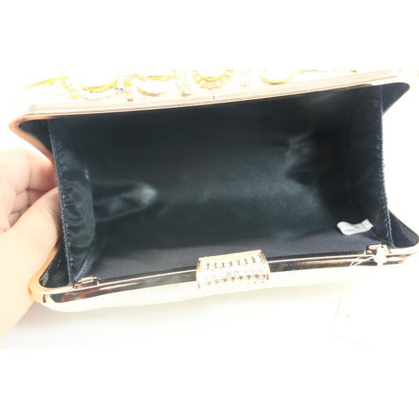 This is a fashionable high-end ladies' evening gift handbag. It is made of high-end fabrics, inlaid with crystal diamonds, simulated pearls, tube beads, multiple shapes, milky white plastic beads and other materials.