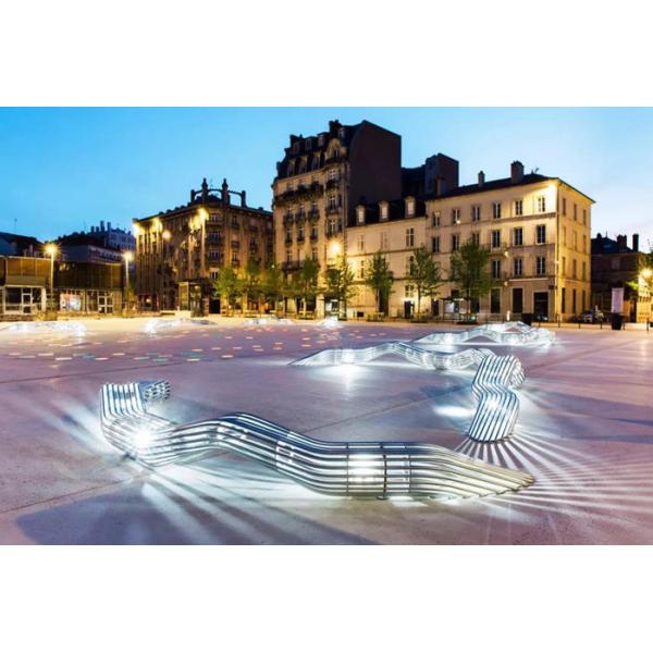It is just an outdoor square seat composed of stainless steel tubes. The middle is hollowed out, and the ground is equipped with lights. The chair can transmit light, which can not only sit and rest, but also have decorative effect, and can be illuminated at night. This is a design that kills three birds with one stone.