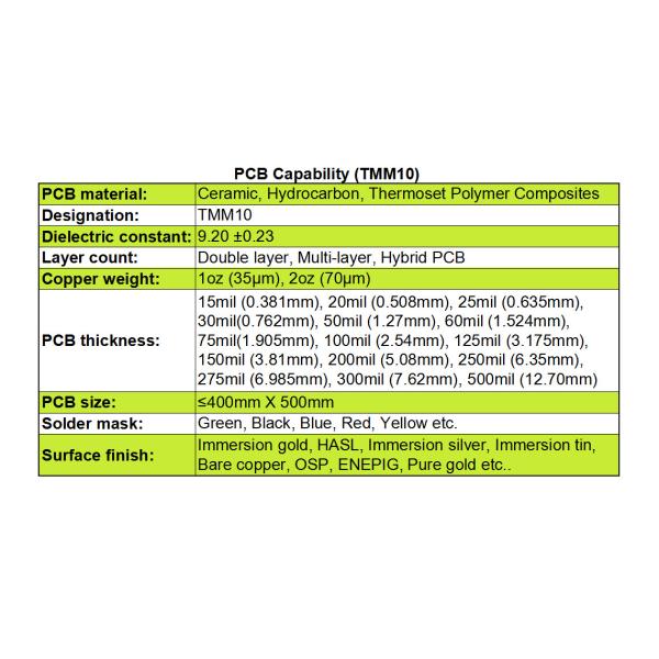 TMM10 PCBs are available in a variety of thicknesses, including 20 mils, 30 mils, 50 mils, and 60 mils. Higher thicknesses, such as 200 mils, 300 mils, and 500 mils, are also available. The maximum PCB size on high-frequency materials is 400mm by 500mm, and TMM10 PCBs can be made into single layer, double layer, multi-layer, and hybrid designs. Solder masks in various colors are available in-house, and a range of protective coatings, including immersion gold, HASL, immersion silver, and immersion tin, as well as OSP, ENEPIG, and pure gold, can be used to protect the SMD pads.