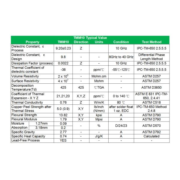 TMM10 has good volume and surface resistivity, and is able to withstand a decomposition temperature (Td) of up to 425℃ (determined by Thermogravimetric Analysis - TGA), which is a safe temperature during PCB assembly. Its coefficient of thermal expansion is similar to that of copper, which ensures that its mechanical properties resist creep and cold flow. TMM10 is also a sort of thermal management board, with a thermal conductivity of 0.76 W/m/K.