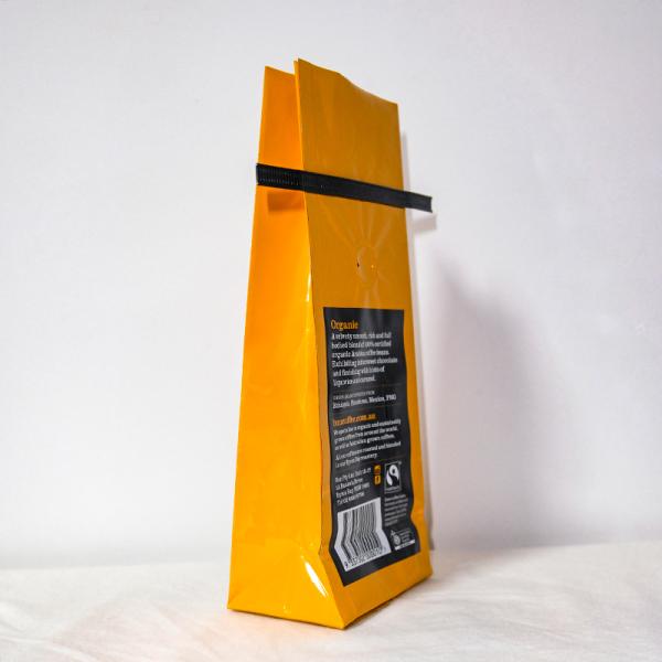 Item | 100% Organic espresso coffee flat bottom bag with valve and tin tie