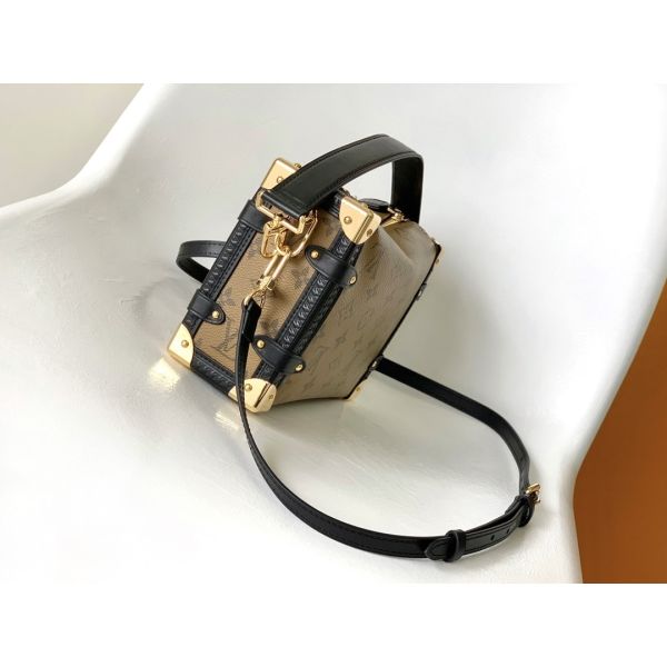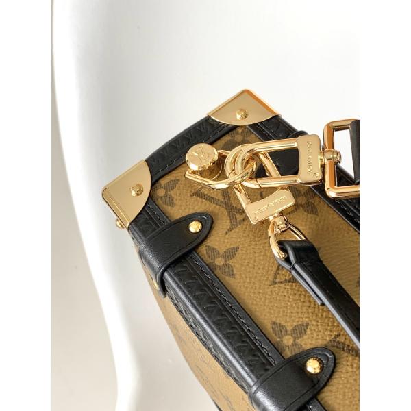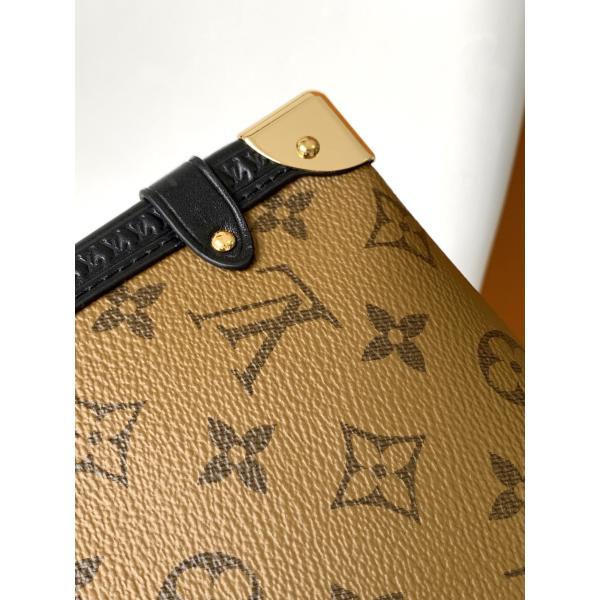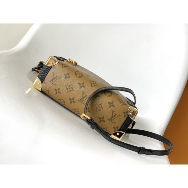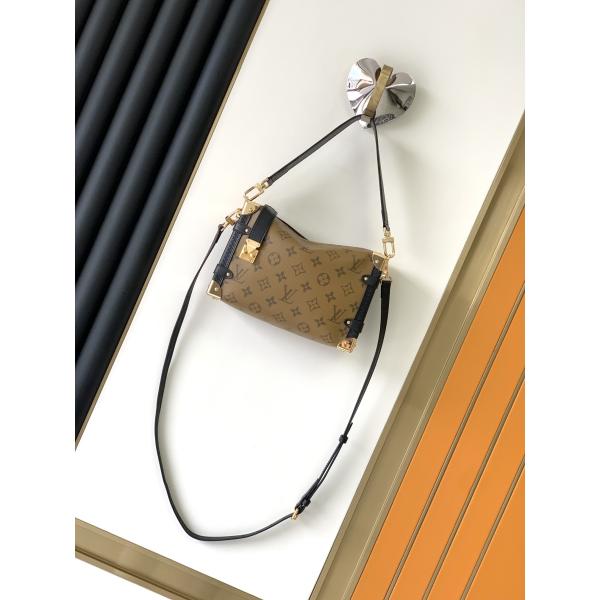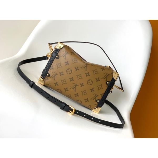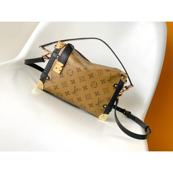 The Side Trunk PM bag by Nicolas Ghesquière in Monogram canvas trimmed with leather pays homage to Louis Vuitton's original trunk-making skills. The unique leather zipper pull is eye-catching, with the classic S-lock buckle and reinforced metal corners, while the wide top handle and adjustable small shoulder strap are all detachable.