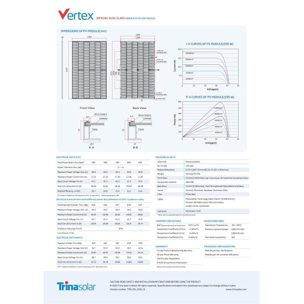 Power Output: The Trina 580W, 585W, 590W, 595W, and 600W solar panels provide high wattage options for various applications, including residential, commercial, and utility-scale installations. These panels are designed to deliver significant electricity generation capacity, allowing for efficient utilization of available space.
